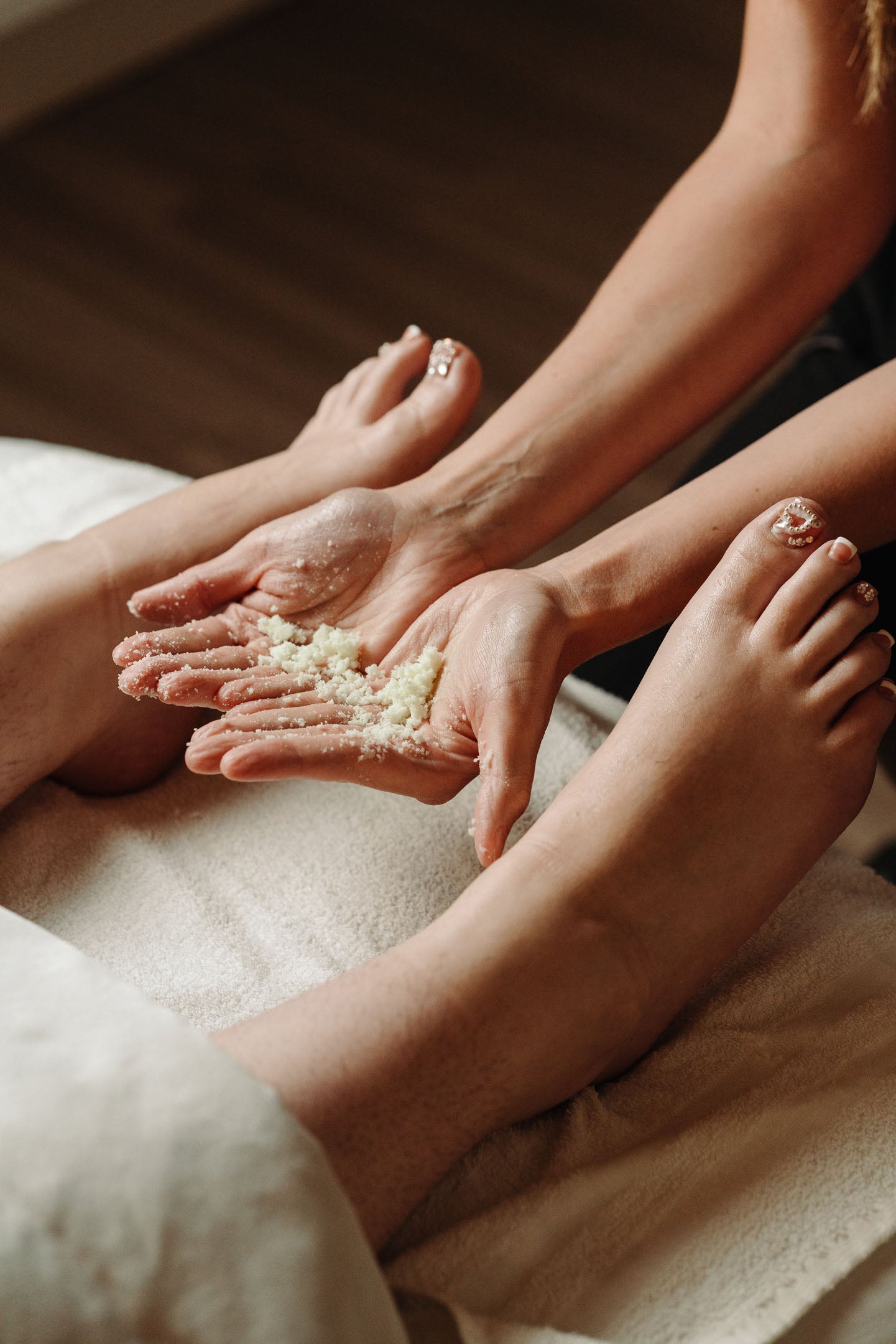 Treat your feet to the ultimate pampering experience with our Rejuvenating Foot Scrub. This luxurious add-on begins with an invigorating salt or sugar scrub to gently exfoliate and renew your skin. Warm, soothing towels follow to relax tired feet and remove the scrub, leaving your skin feeling soft and refreshed. Finally, a calming foot massage completes the service, melting away tension and leaving you utterly revitalized. Wrap up the last 10-15 minutes of your session with this enhancement.